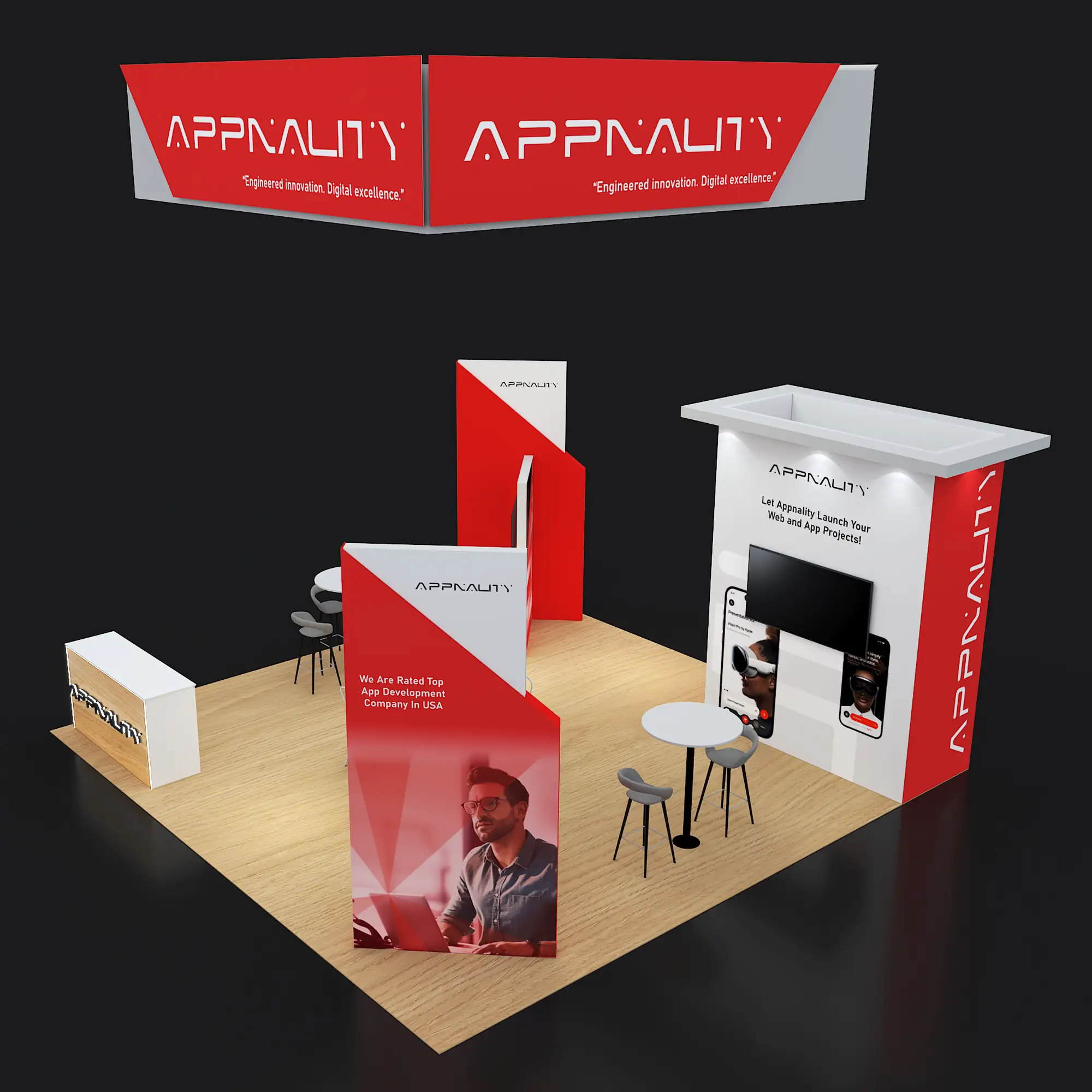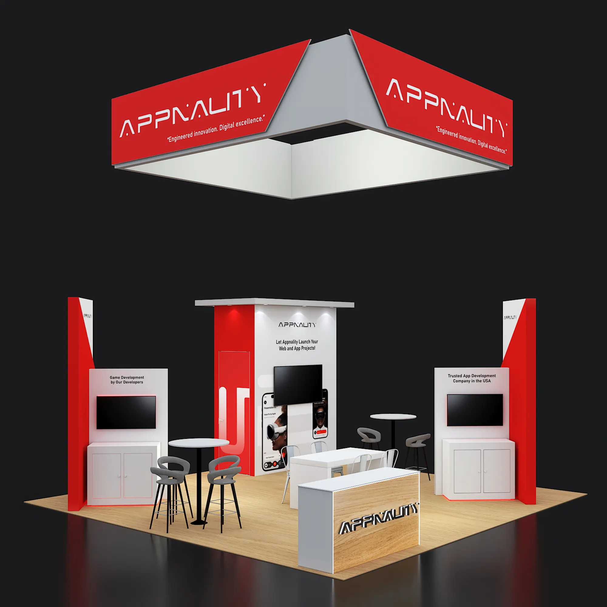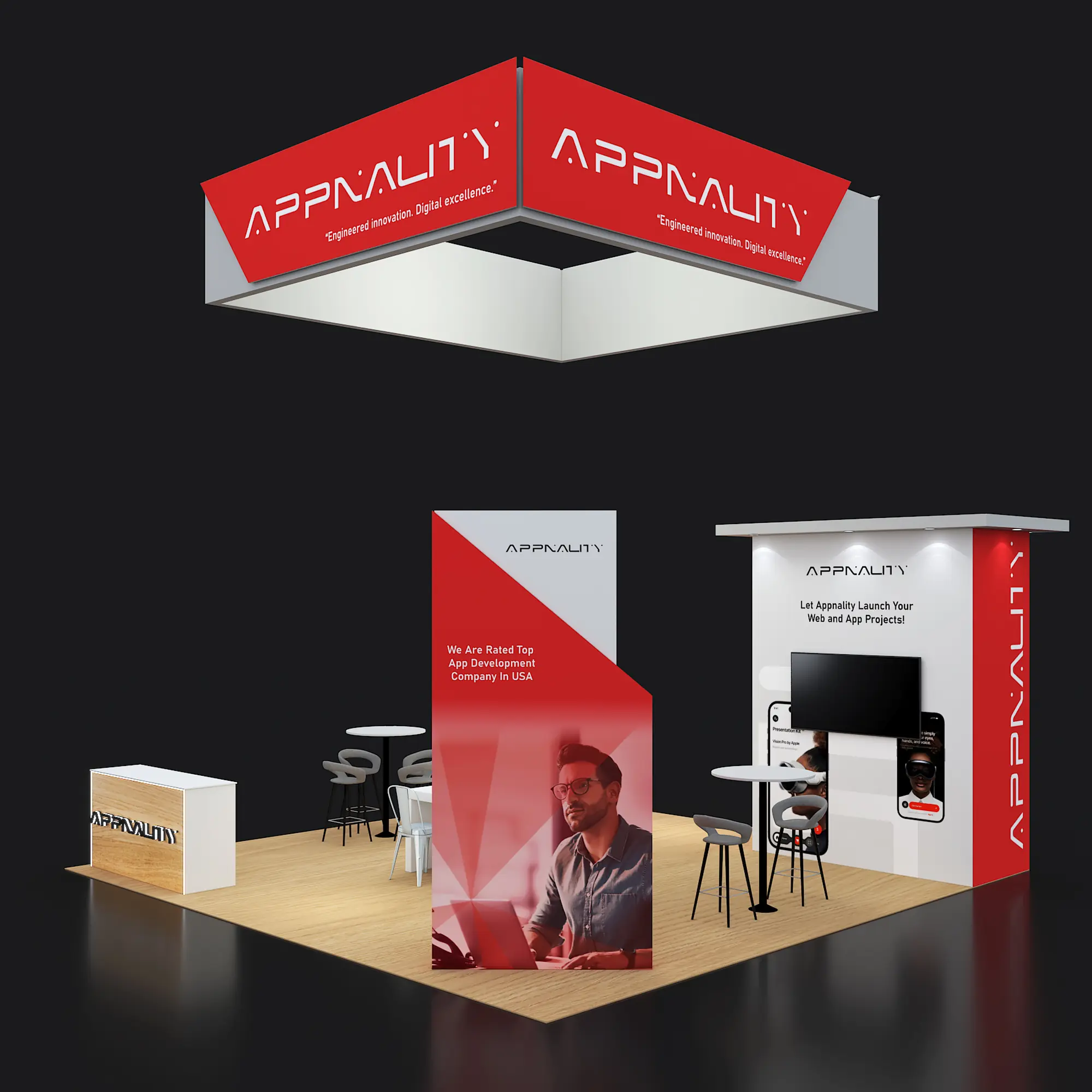 Artwork, power, rigging, and media pre-flighted to the booth spec—no format surprises.